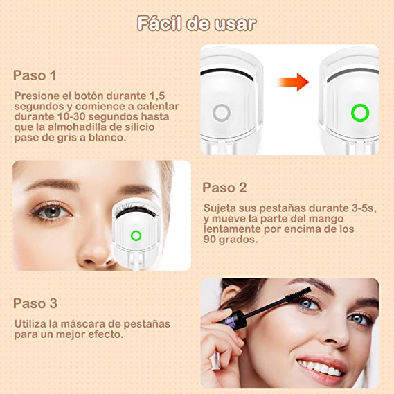 Fácil de usar, solo necesita presionar y mantener presionado el interruptor para calentar, espere 30 segundos. Puede aplicar delineador de ojos o cualquier otra cosa durante estos 30 segundos. Después de un corte suave, tus pestañas se rizan al instante. crea las pestañas rizadas más voluminosas en segundos. Y el resultado te durará 12 horas.